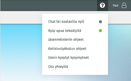 Botti osaa vastata suurimpaan osaan Yhdistysavaimen käyttöä koskevista kysymyksistä, mutta laskutukseen ja sopimuksiin liittyvissä asioissa se ohjaa sinut ottamaan yhteyttä asiakaspalveluumme.