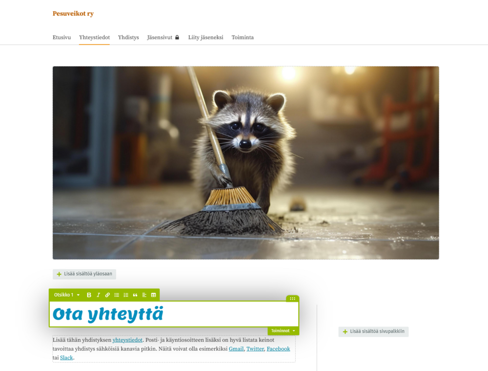 Alempana sivulla näkyy muokkaustilassa aktiiviseksi klikattu tekstiosio, jossa on otsikko "Ota yhteyttä".