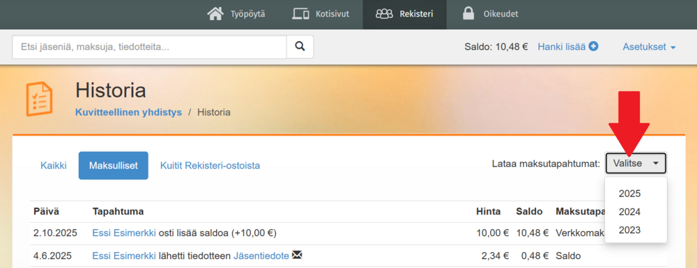 Raportin saat ladattua rekisterin Historia-näkymässä valitsemalla "Maksulliset" > "Lataa maksutapahtumat" > valitse haluamasi vuosi.